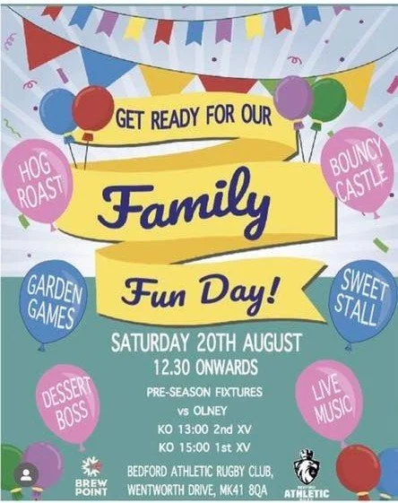 Back to All Events Family Fun Day Saturday 20 August 2022 12:30 18:00 Bedford Athletic rugby club Wentworth Drive Bedford, England, MK41 8QA United Kingdom (map) Google Calendar ICS